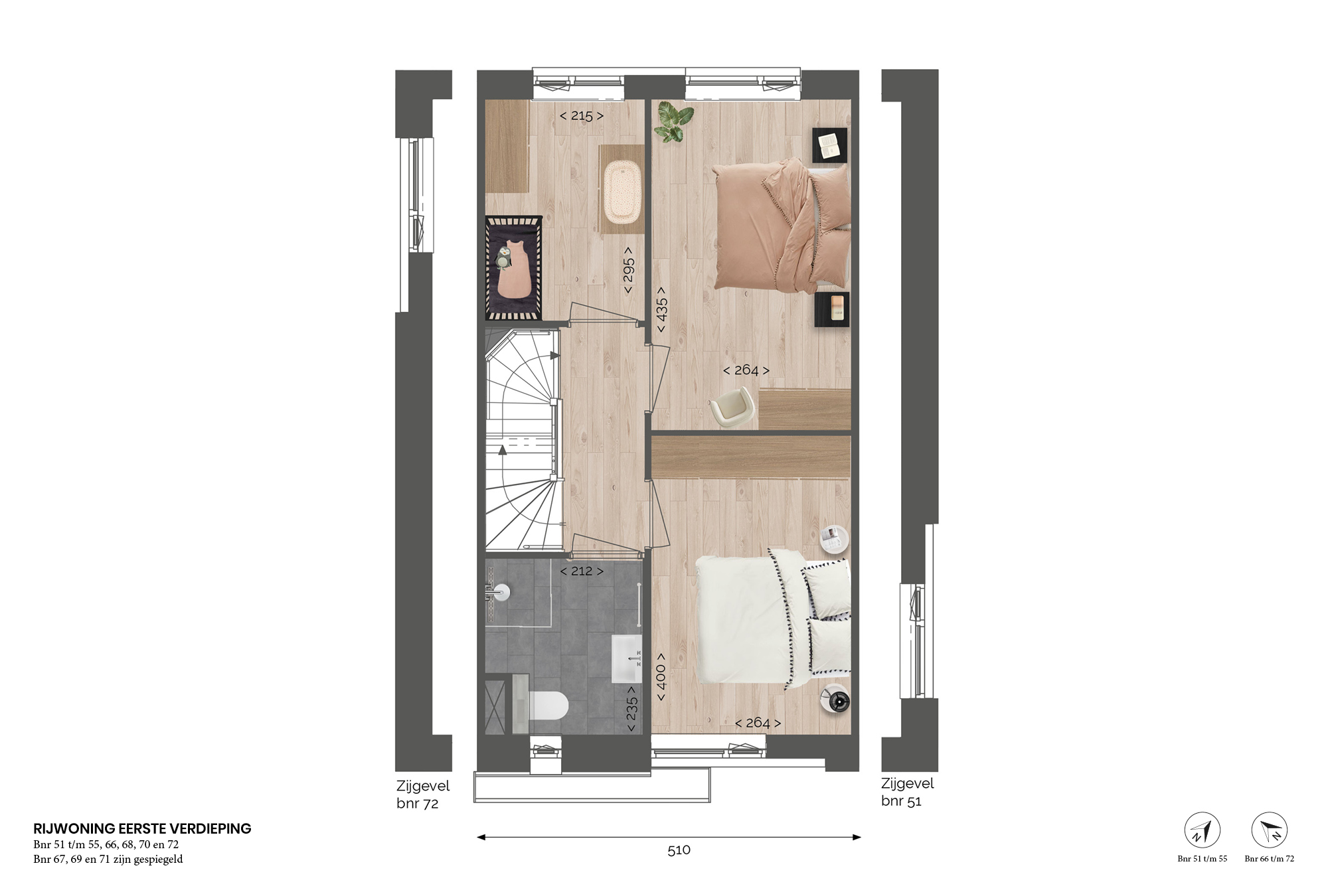 van ca. 104 m² met leefruimte voor het hele gezin - Bwnrs. 52 en 68 beschikken standaard over een dakkapel en hebben hierdoor 106 m² woonoppervlakte