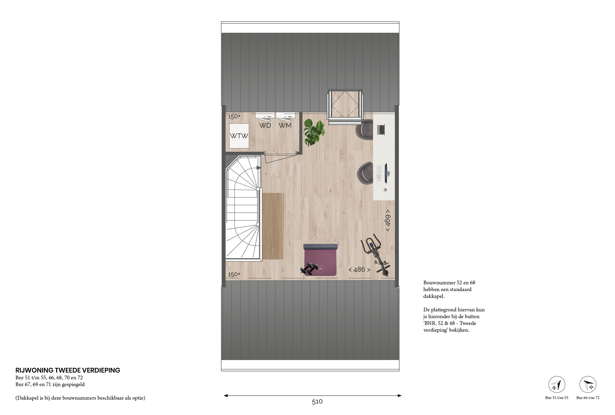 Bouwnummers 52 en 68 beschikken over een dakkapel, waardoor het woonoppervlak wordt vergroot naar circa 106 m².