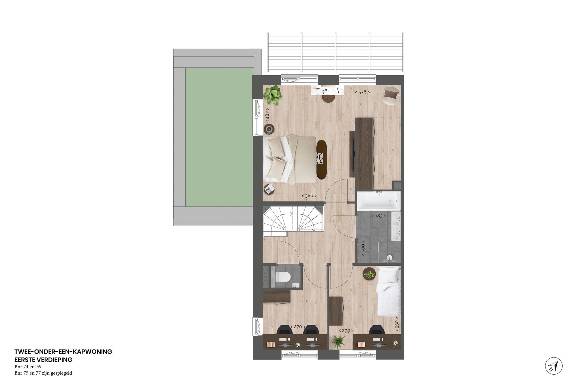 Type Iris bestaat uit vier ruime twee-onder-een-kapwoningen van circa 165 m², gelegen in een groene omgeving met uitzicht op natuur en een wandelroute. De tuinen liggen op het noordwesten en bieden volop middag- en avondzon. Dankzij de pergola ontstaat een mooie overgang tussen binnen en buiten, waardoor het buitenleven extra comfortabel wordt.